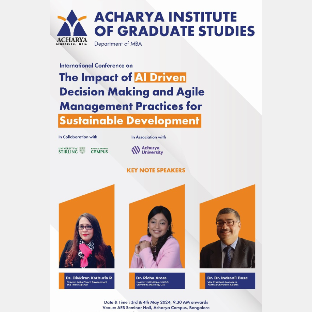 The University of Stirling RAK Campus is proud to co-host the International Conference on “The Impact of AI-Driven Decision Making and Agile Management Practices for Sustainable Development” on May 3rd and 4th, 2024. This groundbreaking event, held in partnership with the Department of MBA at Acharya Institute of Graduate Studies in Bengaluru, India, brings together distinguished academics, researchers, and business professionals to explore how artificial intelligence is reshaping sustainable business practices across industries.